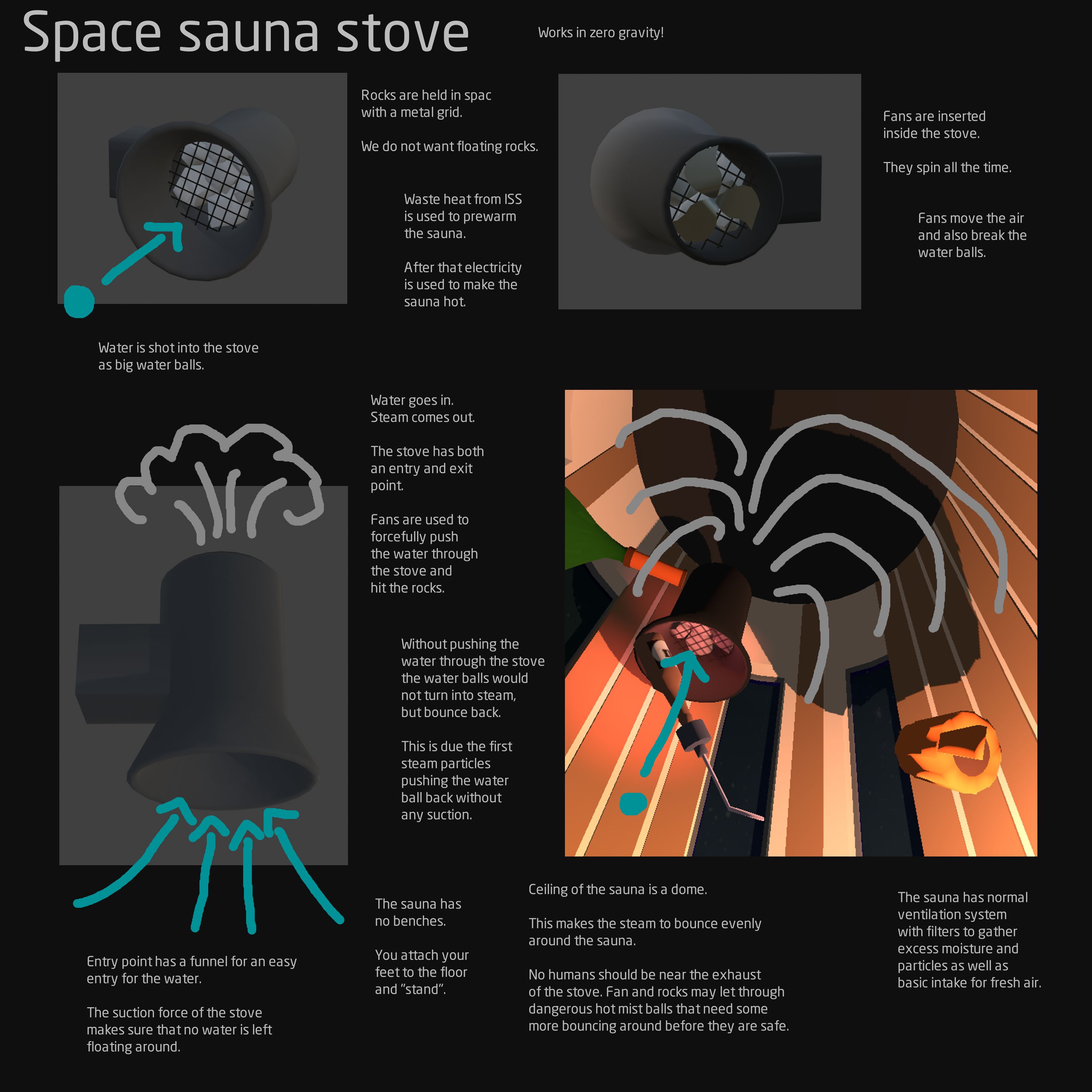 Additionally, the concept for a zero g sauna stove was developed with help from an Aalto University professors. It functions by sucking a zero-g water bubble through heated stones with the use of a fan, and blasting the steam generated by the heat through the back. An efficient air circulation system disperses the heated air throughout the module.